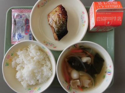 今日は、さば照り焼き、ワンタンスープ、ごはん、牛乳、ちりめんこんぶ
