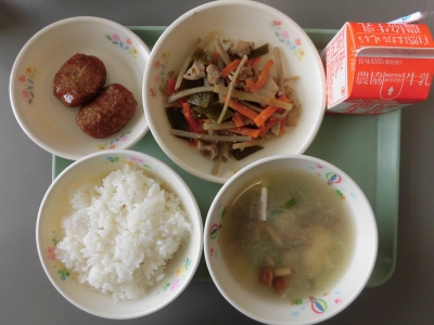 今日は、ごもくきんぴら、なめこじる、レバー入り白ごまつくね、ごはん、牛乳