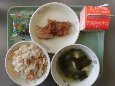 今日は、たけのこごはん、牛乳、かつおのなんばんづけ、わかめ汁、かしわもち