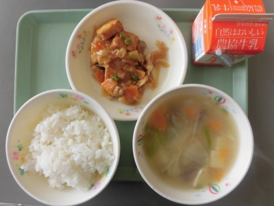 今日は、ごはん、牛乳、マーボあつあげ、みそけんちん汁 でした。