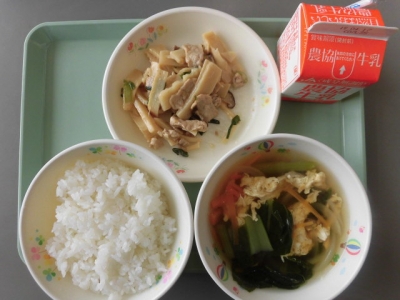 今日は、ごはん、牛乳、オイスターソースいため、小松菜と卵のスープ