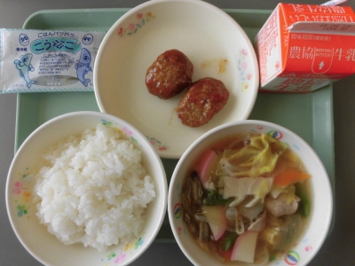 今日は、ごはん、牛乳、レバー入り白ごまつくね、八宝菜、こうなご でした。