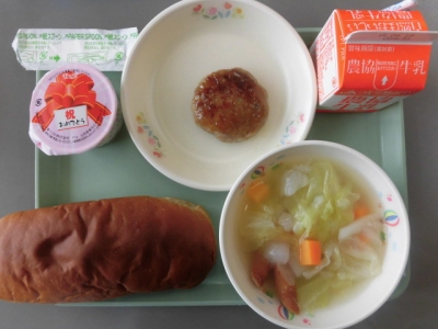 今日は、黒糖パン、牛乳、ハンバーグ、てりやきソースがけ、ポトフ、