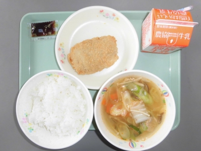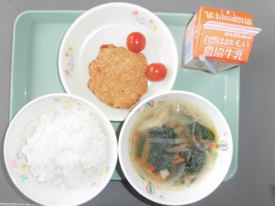 今日は、チキンみそカツ、ミニトマト、水ぎょうざスープ、ごはん、牛乳