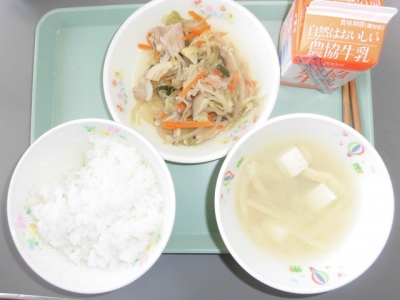 今日は、もやしと豚肉の油いため、だいこんのみそ汁、ごはん、牛乳