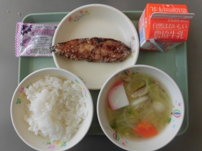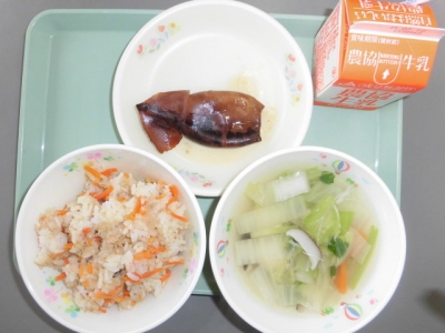 今日は、ツナごはん、牛乳、いかてりやき、ほたてスープでした。