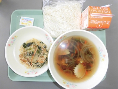 今日は、山菜うどん、牛乳、なの花かき揚げ、チーズでした。