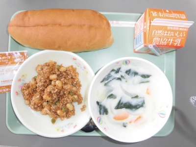 今日は、ドッグパン、牛乳、チリコンカン、ほうれん草のシチュー、