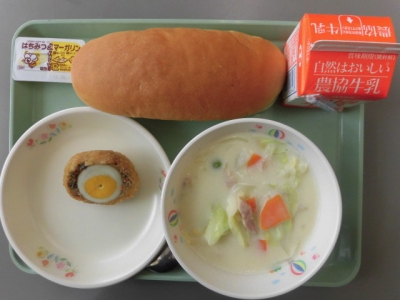 今日は、コッペパン、牛乳、スコッチエッグ、はちみつ&マーガリン、
