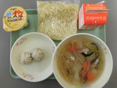 今日は、しおラーメン、牛乳、ミニパオズ、なかよしプリン でした。
