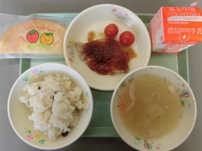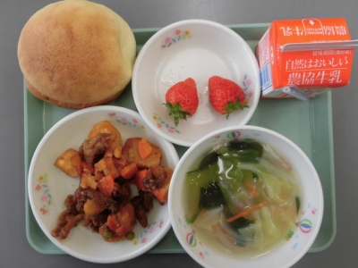 今日は、メロンパン、牛乳、あまからポテト、やさいスープ でした。