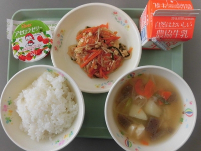 今日は、豆腐ハンバーグ、野菜あんかけ、豚汁、ごはん、牛乳 でした。