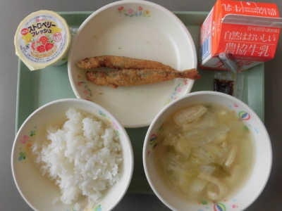 今日は、こもちししゃもフライ、はくさい汁、ごはん、牛乳 でした。