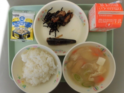 今日は、いわしのしょうが煮、ひじきの油いため、ご汁、ふく豆、牛乳、ごはん