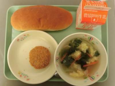 今日は、コッペパン、牛乳、野菜メンチカツ、イタリアンスープ、いちごジャム