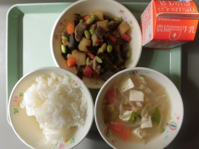 今日は、五目まめ、どさんこ汁、ごはん、牛乳 でした。