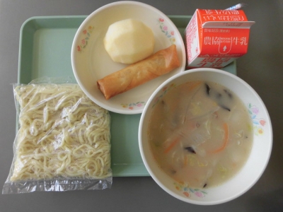 今日は、とんこつラーメン、牛乳、ごもくはるさめ、りんご