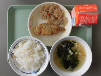 今日は、かきたま汁、レンコンのきんぴら、しろみざかなのりごまあげ、ごはん、牛乳 でした。シャキシャキした食感が楽しいれんこんは、蓮の根が大きくなったものです。