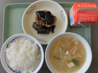 今日は、なすととり肉のあげに、ごじる、ごはん、牛乳 でした。呉汁は、