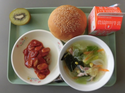 今日は、バーガーパン、牛乳、ハンバーグ、やさいスープ、キウイフルーツ