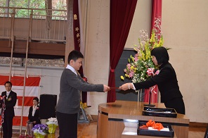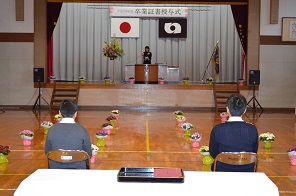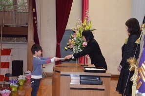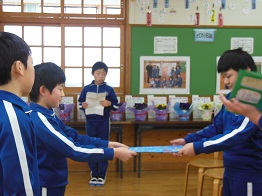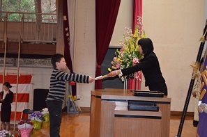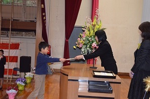 3年生5名、5年生8名、計16名の在校生を代表して各学年1名ずつ、校長先生から修了証書を受け取りました。