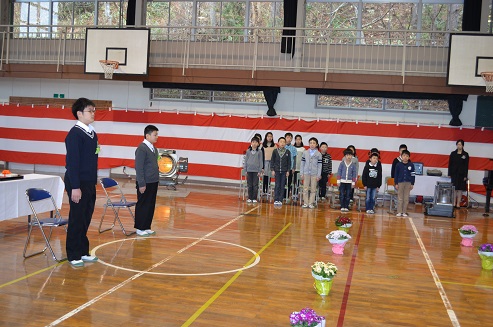 校長先生から転出される2名の先生方の紹介があり、それぞれの先生方から子どもたちに向け、感謝と励ま