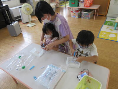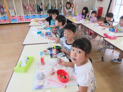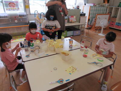 夏祭り会に向けて、ダンスに使用するマラカス作りをしました。入れる材料や模様も自分で考えてデコレーションしました。