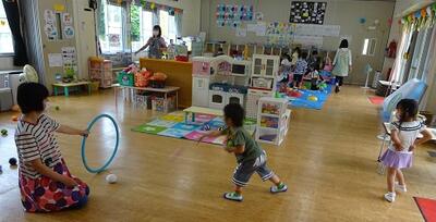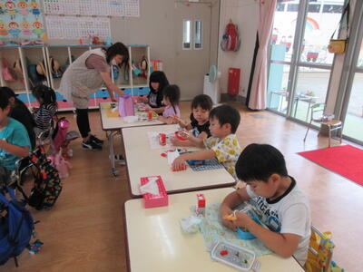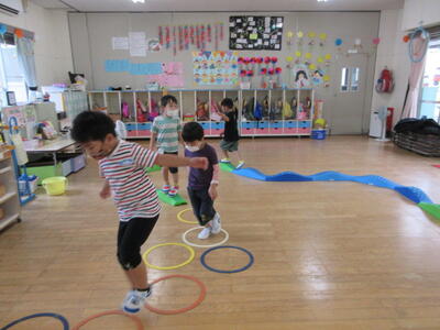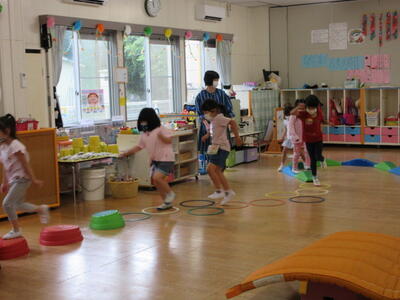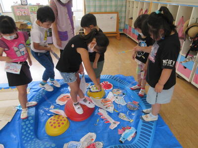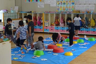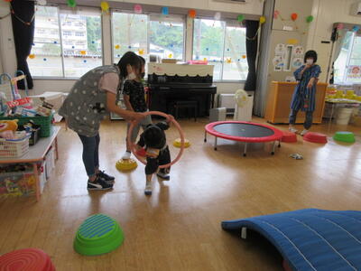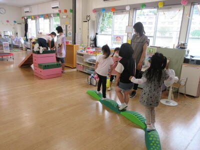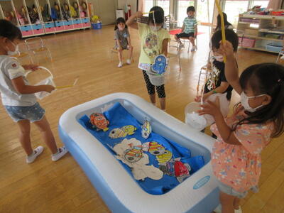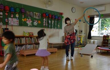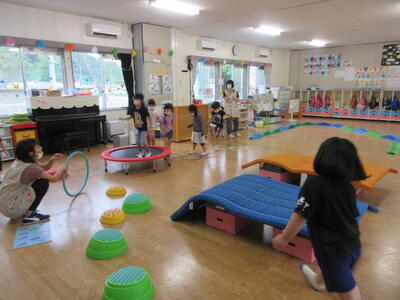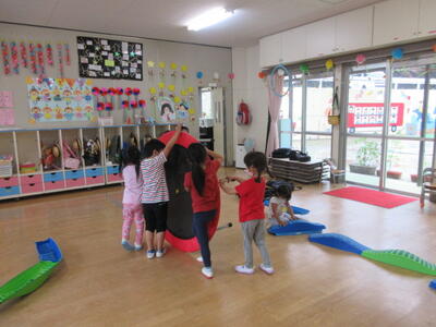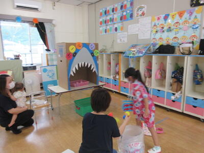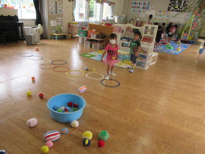 今日の活動の様子です。ひよこ組さんは、ボール遊びをしていました。かごに投げたり、輪っかを通したりして遊びました。ほし組さんは、魚つりをしていました。先週より魚の数が多くなったので、子どもたちは大喜びで活動していました。中には、魚の数を数えている子もいました。10匹捕まえたようです。