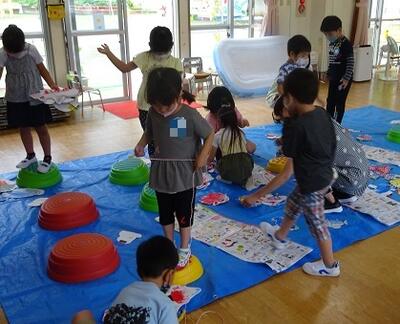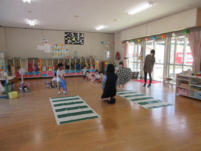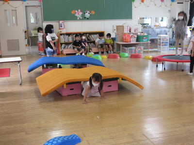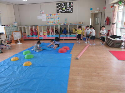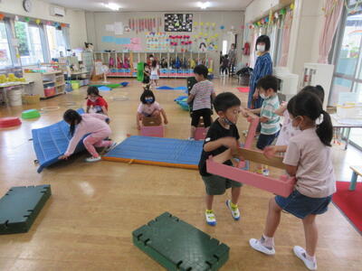 室内でのアスレチック遊びを楽しみました。準備も片付けもみんなで協力すると早くできるね。