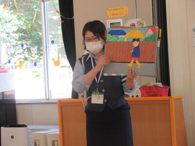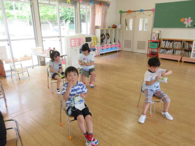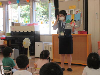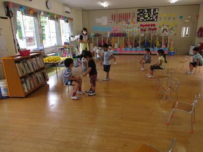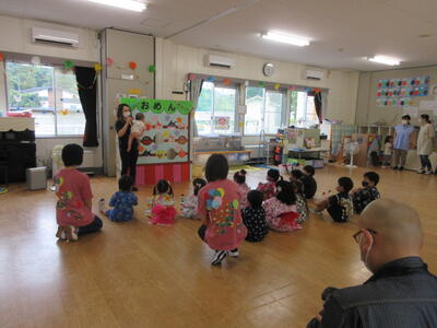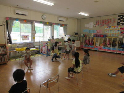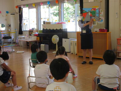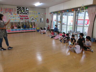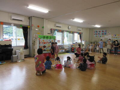 今日は7月生まれのお友達の誕生会をしました。司会はほし組のお兄さんとお姉さんです。