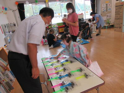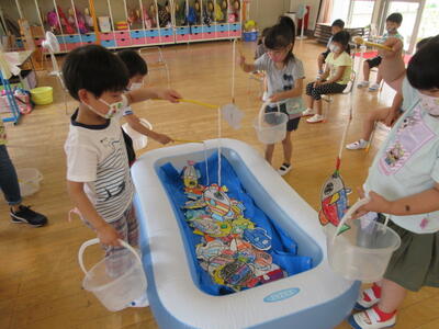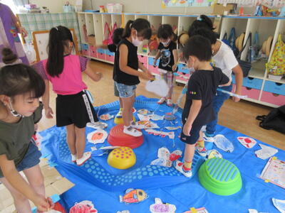 交通教室が終わった後は、魚釣り屋さんが始まりました。今日は、ほし組がお店屋さんになり、ひよこ組を招待しました。
