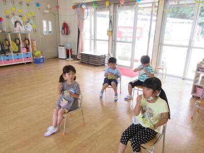 夏祭り会で使うマラカスが完成しました。みんな大喜びで振って音を楽しんでいました。