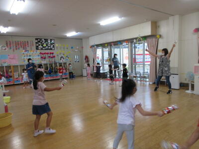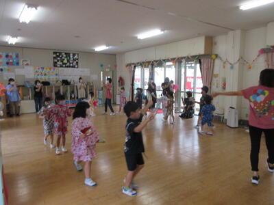 甚平や浴衣姿で登園した子どもたちは、オープニングダンスとして、手作りのマラカスをもって「オ・マ・ツ・リ」と「忍たま音頭」の踊りをおうちの方に披露しました。