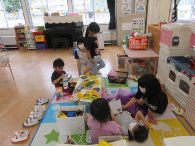 ままごとコーナーでは、ほし組とひよこ組が一緒に遊んでいました。