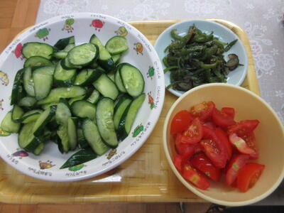 昼食では、収穫したミニトマトやきゅうり、ピーマン、ナスを試食しました。