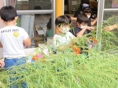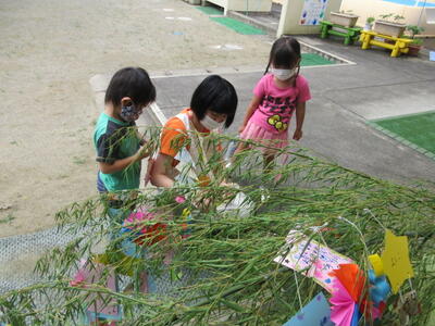 中学校の用務員さんが七夕で飾る笹を届けてくださいました。保育参観でお母さんたちと一緒に作った笹飾りや短冊を飾り付けましたよ。明日の七夕が楽しみですね。