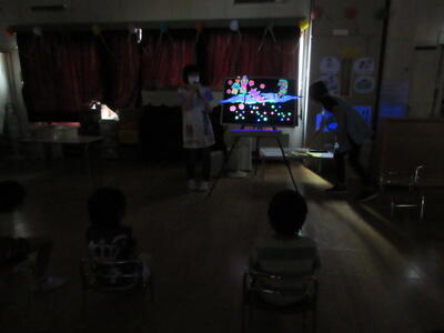 今日は七夕ということもあり、誕生会の後は、七夕のお話をブラックパネルシアターを見ました。