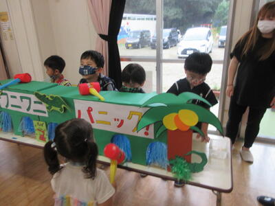 「狙ってワニをたたいてね」お店屋さんの係にも挑戦中!