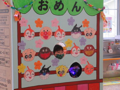 みんなで作った顔出しパネルは「おめんやさん」でした。