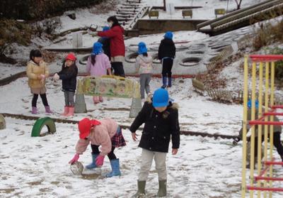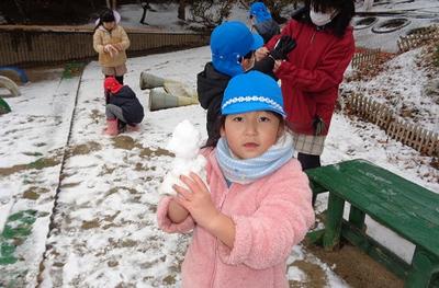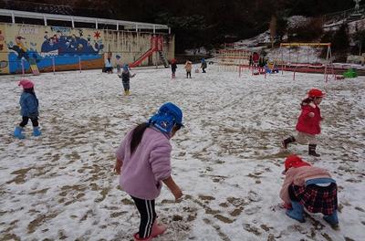子どもたちは、登園後、深夜に降った雪で今年初めての雪遊びをしました。少し湿った雪でしたが、子どもたちは雪を丸めて投げたり、雪だるまを作ったりして楽しみました。