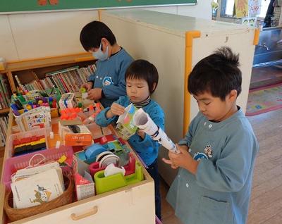 下の写真は、遊び道具を作っている様子です。集中しています。