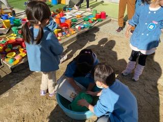 2020年12月18日 17時59分誕生会の後は、2学期にたくさん使った砂場の道具をみんなできれいに洗いました。来週は保育室もみんなで大掃除をして、新しい年を迎える準備をしますよ。(今回は水が冷たいので、お湯も使いました)