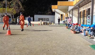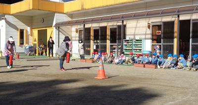 今日、予告なし避難訓練が行われました。近くの建物で火災が発生したという想定訓練でした。子どもたちは、園庭で遊んでいましたが、避難の指示ですばやく園庭の真ん中に集まることができました。その後、整列をして消防士さんのお話を聞きました。