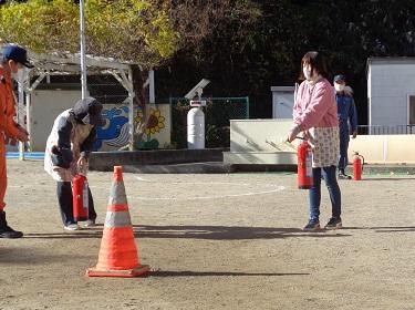 避難した後に、水消火器訓練を教職員対象に行いました。大きな声で火事を知らせる。→黄色いピンを取って、ホースの先端を持ちレバーを握る。→火の下から水をかけ始める。など丁寧に教えてもらいました。子どもたちは教職員の訓練を見て、応援してくれました。