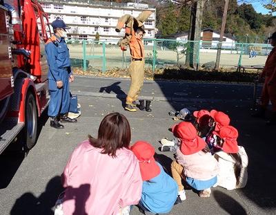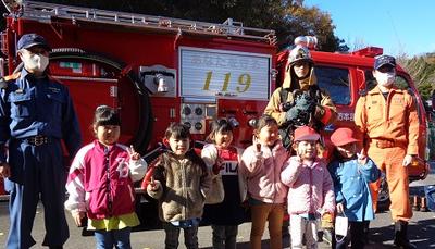 水消火器訓練のあと、子どもたちは消防車を見せてもらいました。3つのグループに分かれて見学しました。下の写真は、ばら組女子の様子です。最初に消火活動をする服装を見せてもらいました。着替えが速くてびっくりしました。その後、ホースをつないで消火するノズルを一人ひとり持たせてもらいました。重くて驚いていました。短い時間でしたが、とてもよい経験ができました。