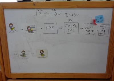 生活発表会後、体調を崩している子も今日は登園し、久しぶりに全員が揃いました。園舎内は、様々な工夫がされています。一つめは、ゴミ箱です。燃えるゴミ、プラスチックゴミ、燃えないゴミなどゴミの分別をしています。二つめは、クリスマスが近づいてきたのでクリスマスツリーが飾られました。子どもたちは興味を持って眺めていました。三つめは、一日のスケジュール掲示です。5歳児は、小学校への進学を見据え、見通しを持って行動する練習をしています。こうした工夫や掲示によって、子どもたちはしっかり成長しています。最後の写真は、今日の昼食の様子です。とてもおいしいパンでした。