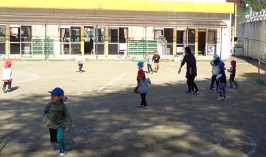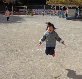 子どもたちは楽しそうに自由遊びをしていました。園庭を眺めていると、「私、鉄棒できるの」「私は、なわとびができるの」と言って、見せてくれました。子どもの向上心はすごいなと思いました。