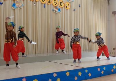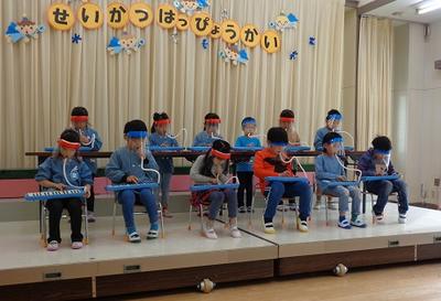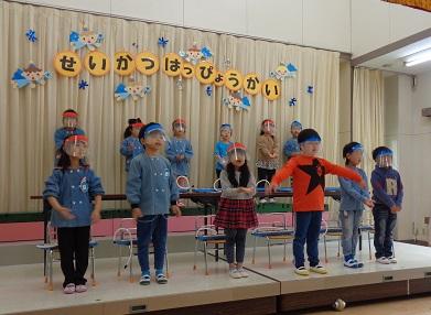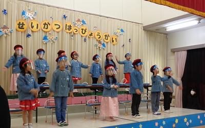 昨日の11月28日(土)、湯本第一幼稚園の生活発表会が行われました。3密をさけるために①学年入れ替え制②保護者制限③換気、飛沫感染を防ぐために④フェイスシールドの着用をして実施しました。子どもたちは、慣れない形の発表会でしたが、元気いっぱい演技をすることができました。下は、ばら組の様子です。