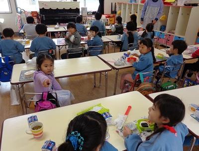 今日は、お弁当でした。子どもたちは、家から持ってきたお弁当を美味しそうに食べていました。美味しいお弁当を食べている子どもたちの笑顔は素敵ですね。さて、明日はいよいよ生活発表会です。今回は、ばら組さんとほし組さんの学年入れ替え制で実施いたします。保護者の皆さま、お待ちしています。