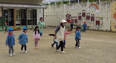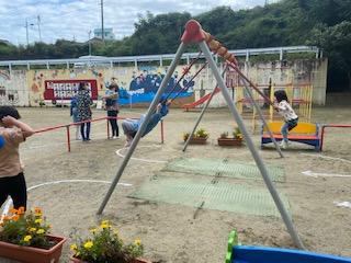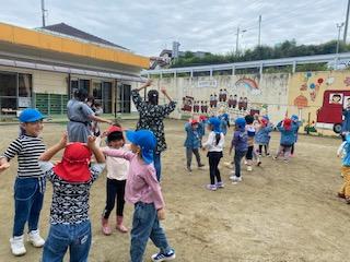 今年度初めてとなったみゅう広場がありました。受付は年長のお兄さんが「お名前はなんですか?」と優しく対応してくれました。園庭で遊ぶにはちょうど良い天気で、リレーごっこや砂遊び、虫探しやダンスを遊びに来てくれた小さいお友達と一緒に楽しむことができました。